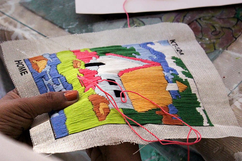Materials used for woolen thread art are minimal and simple; hence, people belonging to any age group can master it. A stencil, reference image, scissors, and needle are the only few materials needed. First, a hessian fabric bearing designs for reference are chosen, and the colour of the woolen threads is fixed as per the reference image. Here hessian fabric, also called burlap, is used as it comes with equidistant gaps easing the effort of stitching. Later an appropriate length of the thread is cut and inserted through the needle's eye to fix its edge with a knot. This woolen thread is then stitched over the outline of the design in double layers. The design may consist of a portion with different colours; hence various coloured woolen threads can be used accordingly. The complete threading work follows the same pattern of vertical stitches throughout. Thus making it ready for sale or hung in a specific area.
