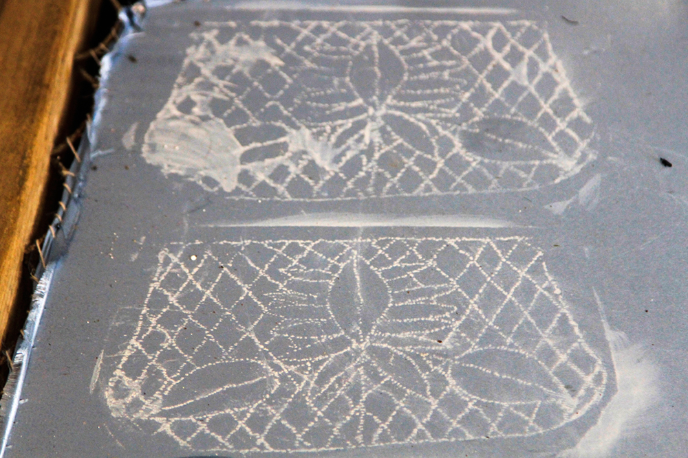 2. Tracing the design onto a piece of fabric is done by placing the patterned butter paper on a flat table with the fabric underneath. Kerosene and color solution is mixed together and this solution is then dipped with a wadded cloth, which is then rubbed over the tracing sheet. This allows the ink from the sheet and the design to get discovered over the fabric.